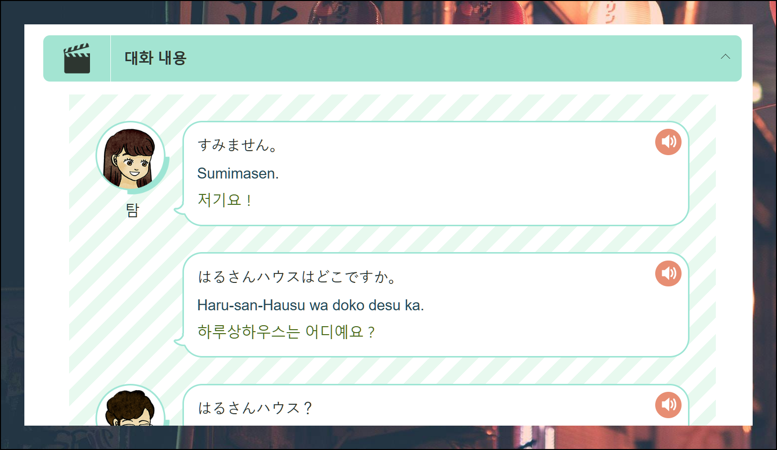 영상 아래에는 일본어, 영어, 한국어로 된 대화 스크립트가 있어요. 음성 듣기도 가능해서 히라가나 학습에 매우 효과적입니다.