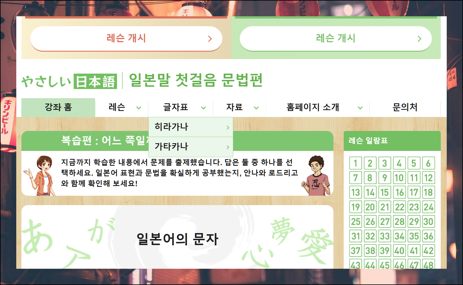 사이트에서 레슨과 자료를 클릭하면 일본어 표를 쉽게 찾을 수 있습니다. 히라가나와 가타카나 중 원하는 항목을 골라 학습을 시작해보세요.