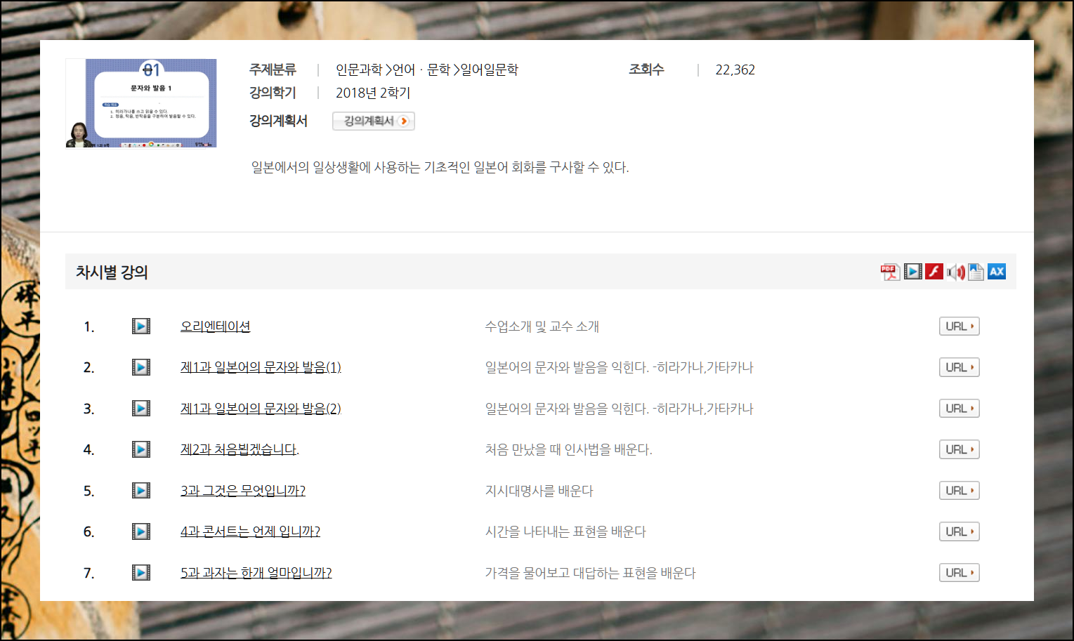 표현문법과 비즈니스 외국어, 한국인을 위한 문형, 한자 연습 등 유용한 일본어 강좌들이 준비되어 있습니다. 무료로 제공되는 양질의 강의를 놓치지 마세요.