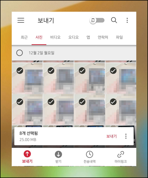 앱을 실행하면 화면 왼쪽 아래에서 보내기 메뉴를 찾을 수 있습니다. 전송하고 싶은 데이터 유형에 따라 사진, 동영상, 연락처, 파일로 구분되어 있어요. 휴대폰에서 원하는 항목을 골라 쉽게 옮길 수 있습니다.