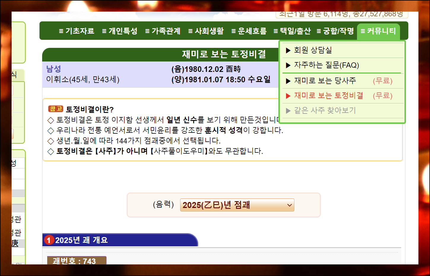 사주풀이 커뮤니티 메뉴에서 다양한 무료 서비스를 만날 수 있어요. 2025년은 물론이고, 그 이후에 해당하는 토정비결 풀이 결과도 미리 확인할 수 있으니 미래 계획에 도움이 될 거예요.