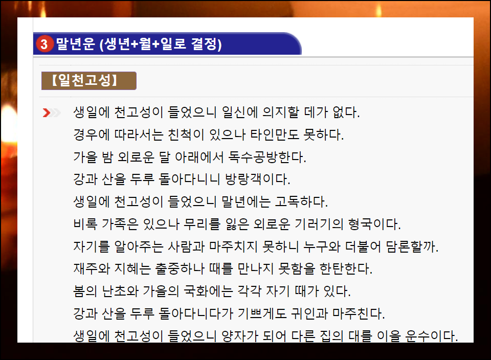 인생의 전체 모습을 알고 싶다면 평생운을 살펴보세요. 변하지 않는 운명의 지도와도 같은 평생운은 삶의 방향을 안내해주는 나침반이 되어줄 수 있어요. 특히 초년, 중년, 말년의 흐름을 이해하면 인생을 더욱 슬기롭게 준비할 수 있습니다.