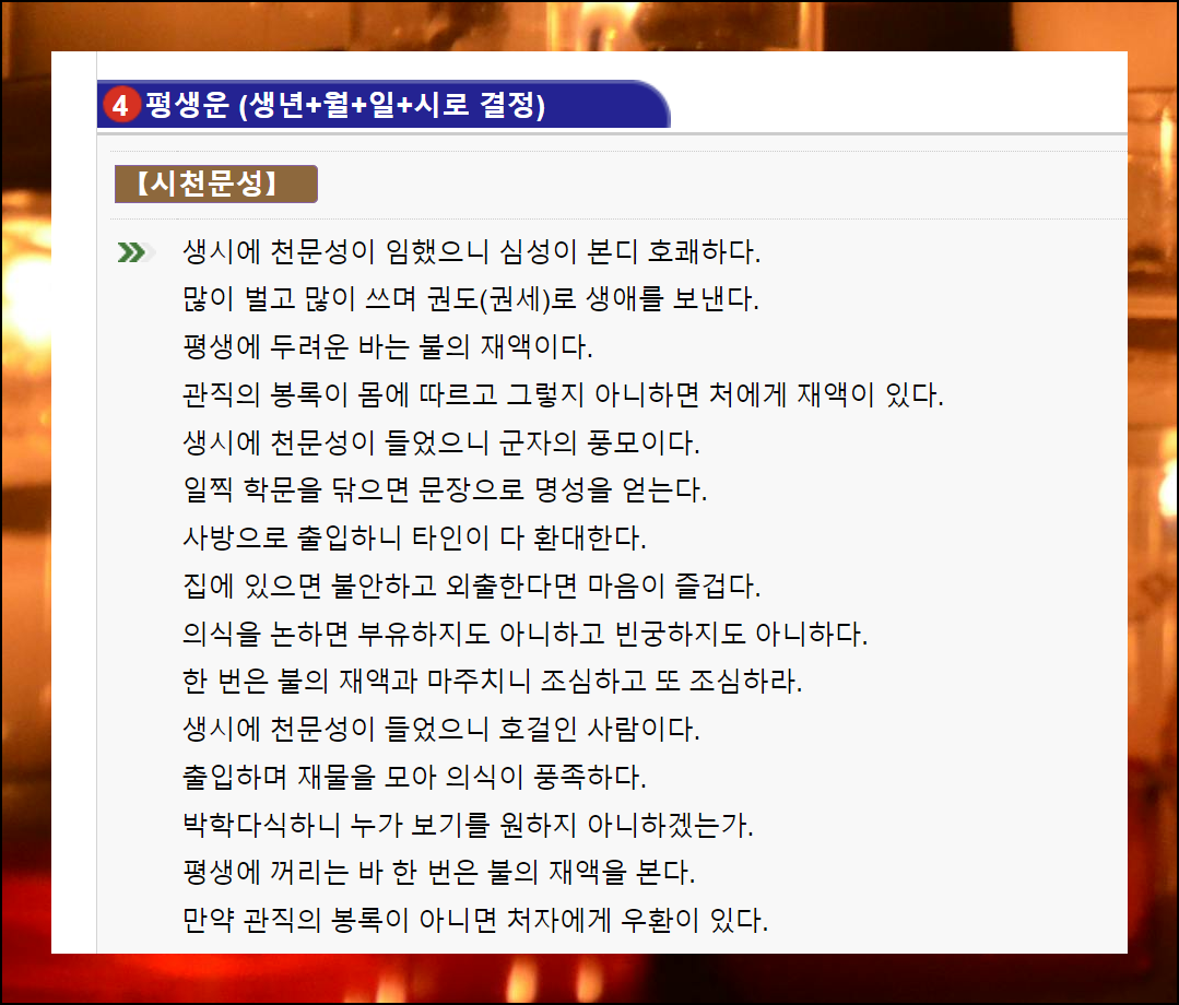 사주풀이의 상세한 해석이 담긴 총운을 확인하세요. 다른 사이트보다 자세한 설명으로 이해하기 쉽습니다.