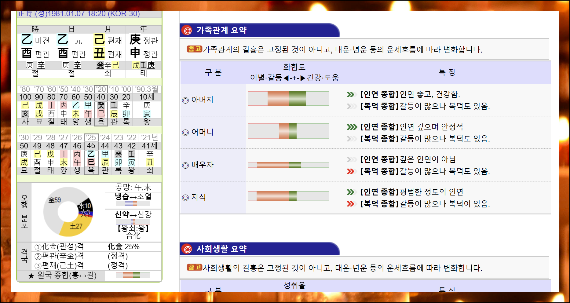 오행은 우리 삶의 기본 요소예요. 화토금목수의 분포를 통해 나의 특성을 이해할 수 있어요. 무료 사주풀이를 통해 가족과의 관계도 한눈에 파악할 수 있으니 미래 계획에 도움이 됩니다.