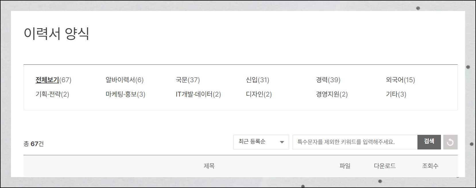 커리어성장 페이지에 접속하면 4번째 위치에 있는 이력서 양식 다운로드 메뉴를 찾을 수 있어요. 원하는 서류를 쉽게 찾을 수 있도록 체계적으로 정리되어 있습니다. 신입부터 경력직까지 모든 구직자를 위한 자료가 준비되어 있죠.