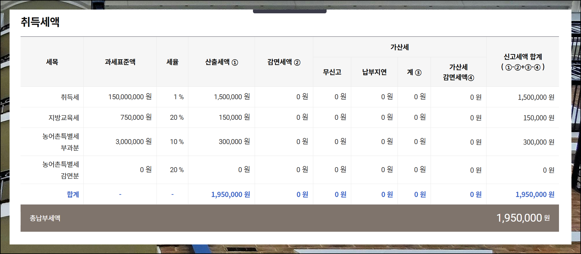 결과는 한눈에 보기 쉽게 표로 정리되어 나타나요. 예시를 들어볼께요. 1억 5천만원짜리 집을 살 때는 195만원의 세금이 필요해요. 취등록세 계산기를 통해 취득세, 농특세 등 여러 세금이 포함된 금액을 확인할 수 있어요. 이런 식으로 부동산 구입을 할 때 세금이 얼마나 될 지 자동으로 산출해서 알려줍니다.