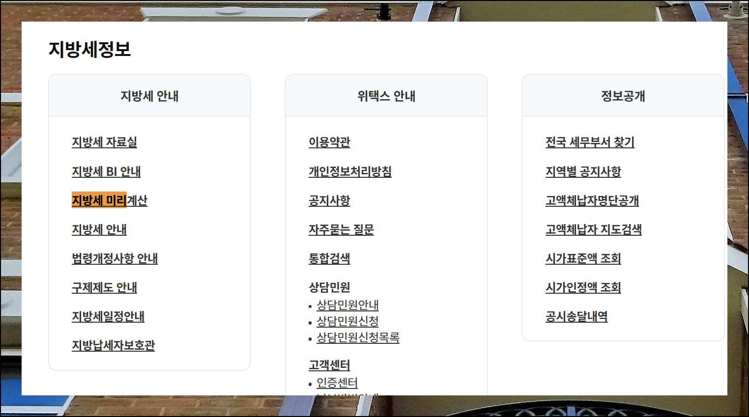 메뉴 버튼을 누르면 서비스 전체 목록이 나타나요. 취등록세 계산기는 "지방세 미리 계산" 메뉴를 선택하면 돼요. 부동산 세금 자동 계산하기 진행을 하는 데에 꽤 유용한 서비스입니다. 누구나 해당 기능을 통해 간편하게 이용할 수 있어요.