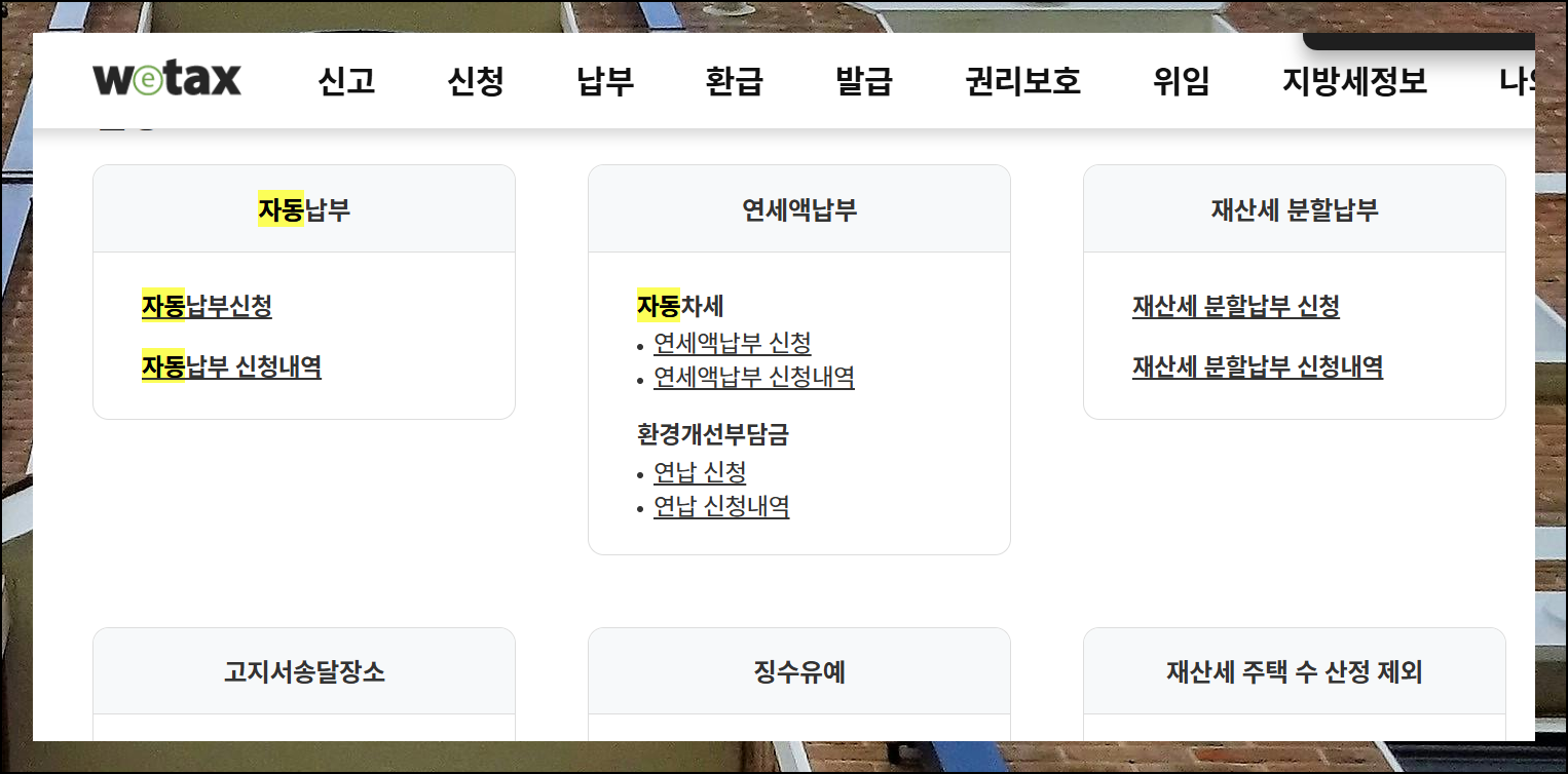 화면 구성이 아주 직관적이에요. 전체 메뉴를 선택해 보세요. 그럼 쉽게 세금 관련 메뉴를 찾을 수 있고, 검색을 통해서 찾는 것도 가능합니다. 여기에서 부동산 세금을 자동으로 계산하는 페이지를 찾을 수 있어요. 여기서 꿀팁 하나 알려드리면, 자동이체 서비스를 신청해두면 매번 수동으로 납부하는 번거로움을 덜 수 있습니다.