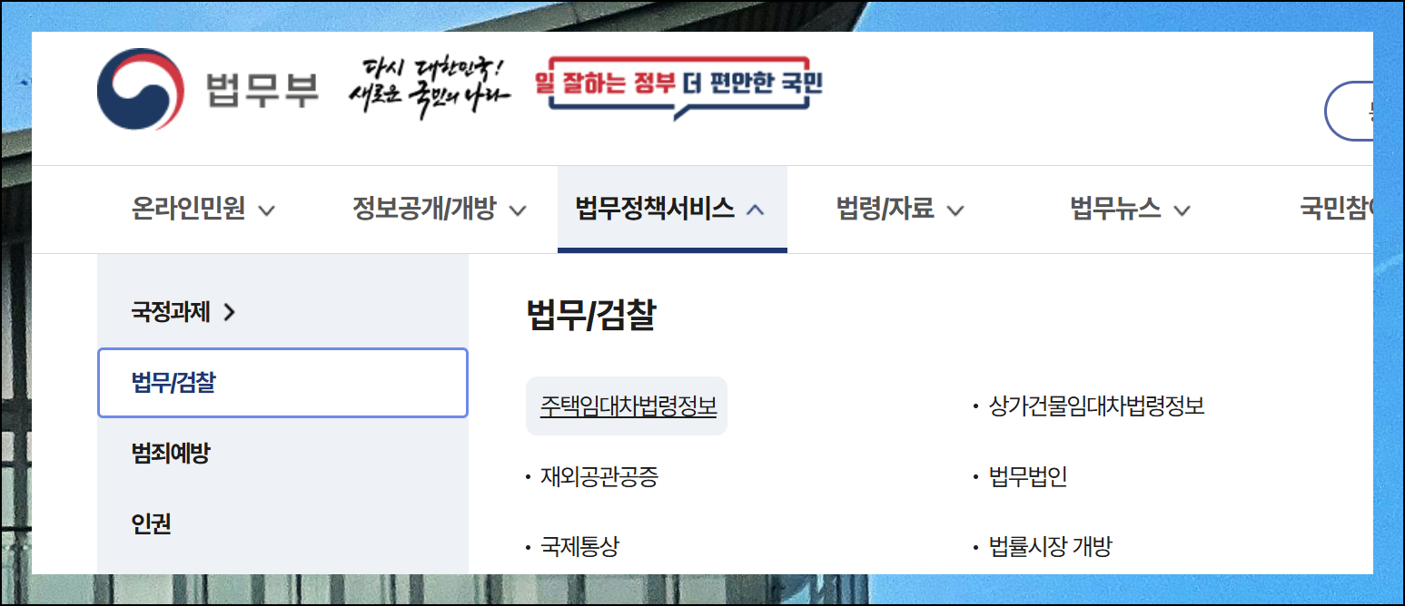 메인 화면에서 법무정책서비스와 법무검찰 메뉴를 순서대로 선택하시면 됩니다. 누구나 쉽게 찾을 수 있도록 구성되어 있으며, 무료 양식 다운로드 페이지까지 직관적으로 이동할 수 있어요.