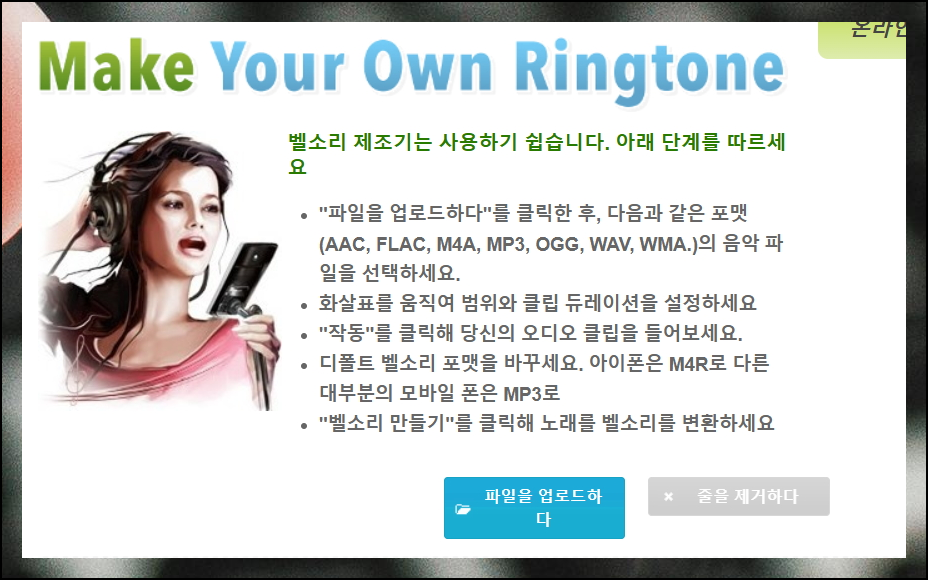 다양한 음악 파일 형식을 지원하고 있으니 마음껏 업로드하세요. mp3부터 flac까지 원하는 포맷을 선택할 수 있어요. 고음질 벨소리도 무료로 만들 수 있습니다.