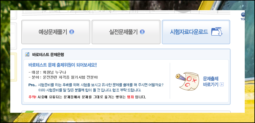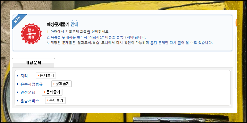 문제은행식 출제 방식이라는 특징이 있어요. 기출문제를 많이 풀어보신 분들이 유리하시죠. 택시운전 자격시험 자료를 구하는 것이 어렵게 느껴질 수 있습니다. 제가 하는 데로 따라하면 무료로 이용할 수 있으니 걱정하지 마세요.