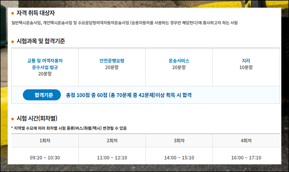 택시운전 자격시험 합격을 위한 핵심 정보를 알려드릴게요. 70개 문항 중 42개만 맞추면 합격할 수 있어요. 70분 안에 문제를 다 풀어야 하니까 한 문항당 1분 정도로 시간 분배를 하시면 좋아요. 100점 만점에 60점이 넘으면 됩니다.