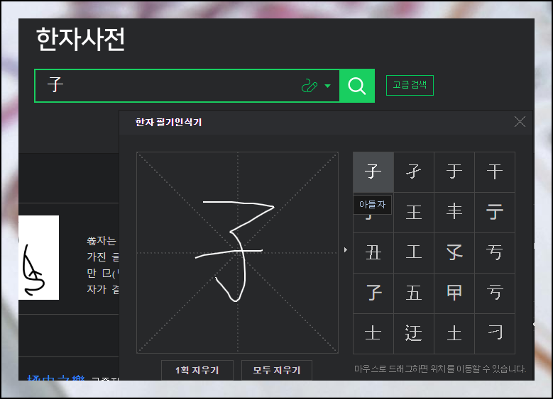 문자를 키보드로 타이핑할 때는 특수키를 사용하고 여러 옵션 중에서 하나를 고르는 절차가 조금 번거로울 수 있어요. 이럴 때는 온라인 옥편 서비스에서 제공하는 필기인식기 프로그램을 활용하면 좋습니다. 마우스로 직접 그려서 입력하고자 하는 문자를 입력할 수 있어요.