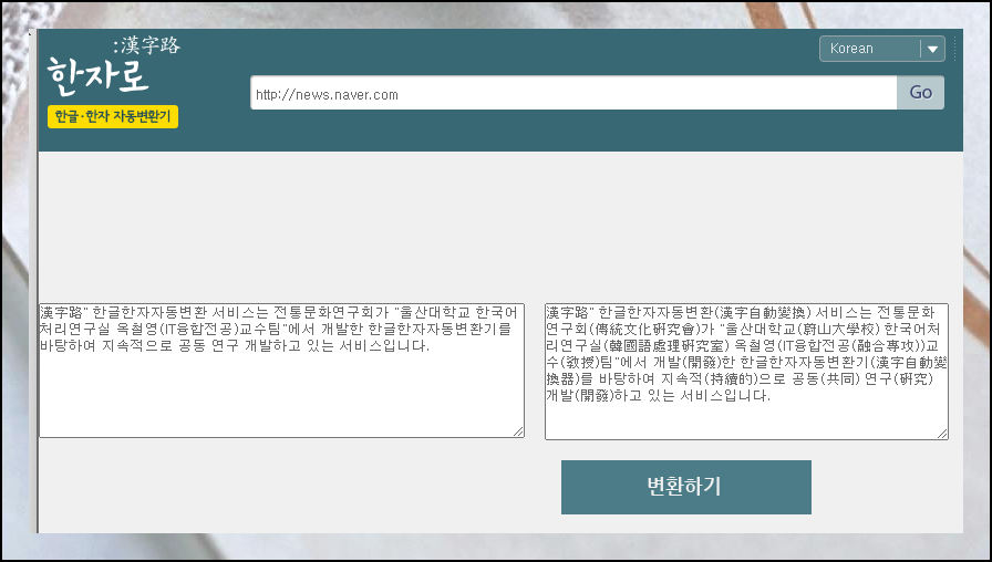 방문한 사이트를 보면 정말 쉽게 한글을 한자로 바꿀 수 있게 구성되어 있답니다. 좌측 부분에 한글 문장을 입력하고, 중앙 하단에 있는 [변환하기] 버튼만 클릭하면 완료예요. 그러면 우측 영역에서 한자로 전환된 문장을 즉시 확인할 수 있습니다.