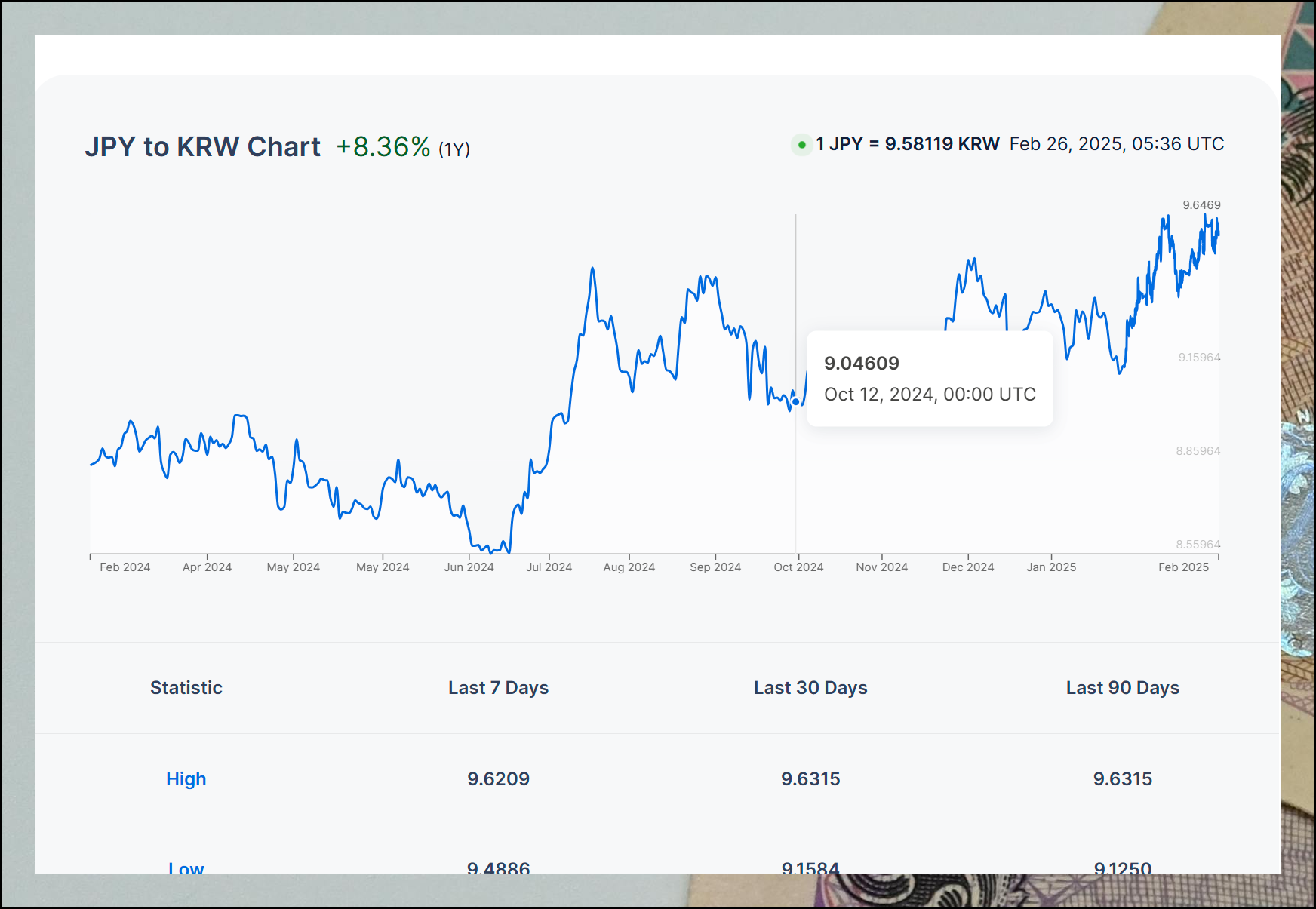 결과 하단에서는 날짜별 시세 변동 그래프를 확인할 수 있어요. 최근 엔화 가치가 소폭 올랐음을 바로 파악할 수 있습니다. 그래프 하단에 있는 표에서는 30일과 90일 동안의 최고치, 최저치, 평균값도 볼 수 있습니다. 이런 데이터는 환전 타이밍을 결정하는 데 큰 도움이 돼요.