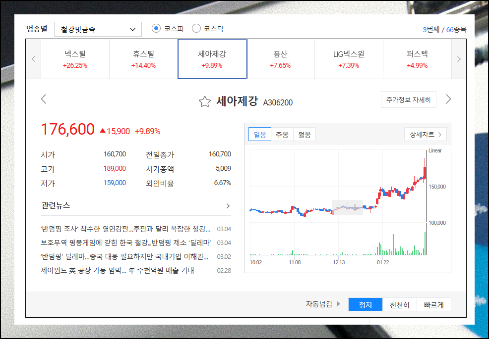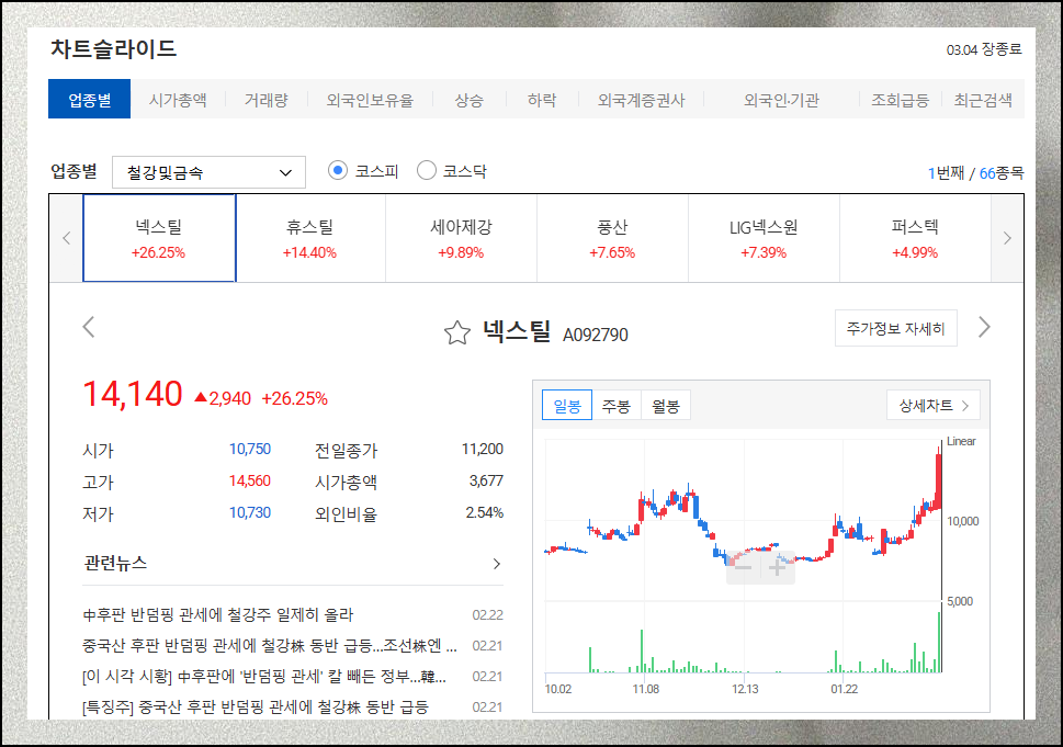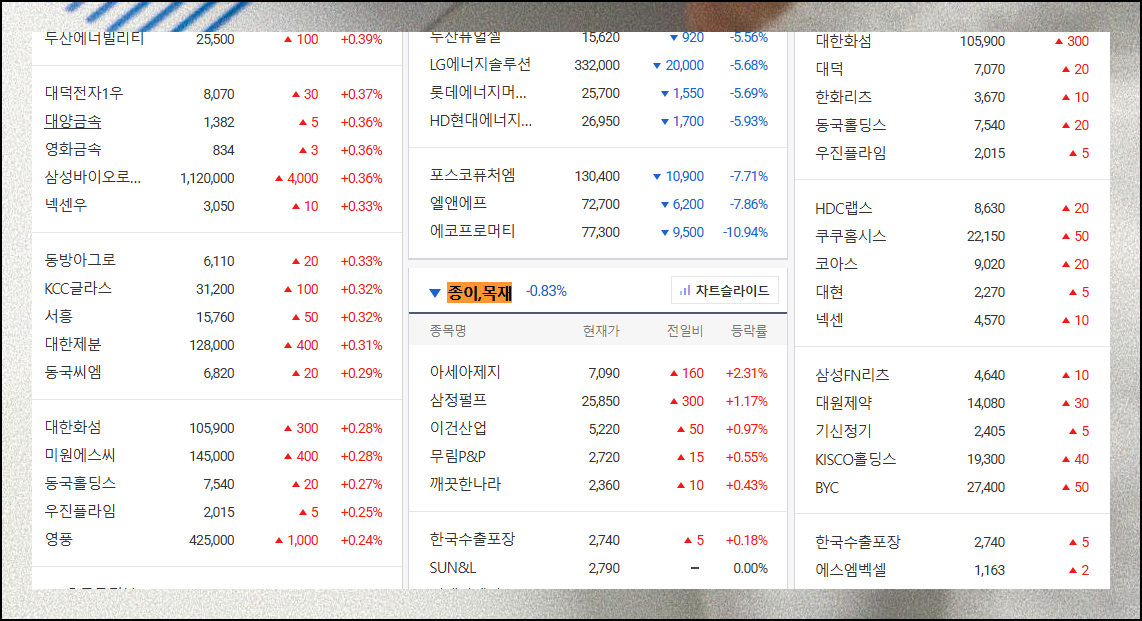 철강금속 같은 특정 업종을 클릭하면 해당 업종에만 집중적으로 살펴볼 수 있습니다. 업종별 강세와 약세를 파악하면 투자할 종목을 선택하는 데에 있어서 도움이 됩니다.