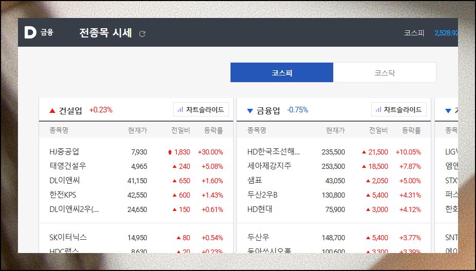 코스피와 코스닥에 상장된 수천 개 종목의 현재가와 등락률을 동시에 확인할 수 있어요. 이를 통해 업종별 강세와 약세를 쉽게 파악할 수 있죠. 게다가 원하는 기준으로 정렬하거나 필터링을 할 수 있어 관심 종목을 효율적으로 관리할 수 있습니다.