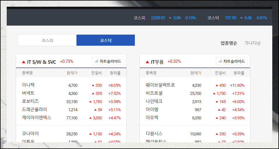표시된 종목들은 업종별로 묶거나 가나다순으로 정렬할 수 있습니다. 가나다순 정렬은 관심 있는 종목의 주식시세를 빠르게 찾을 때 유용합니다.