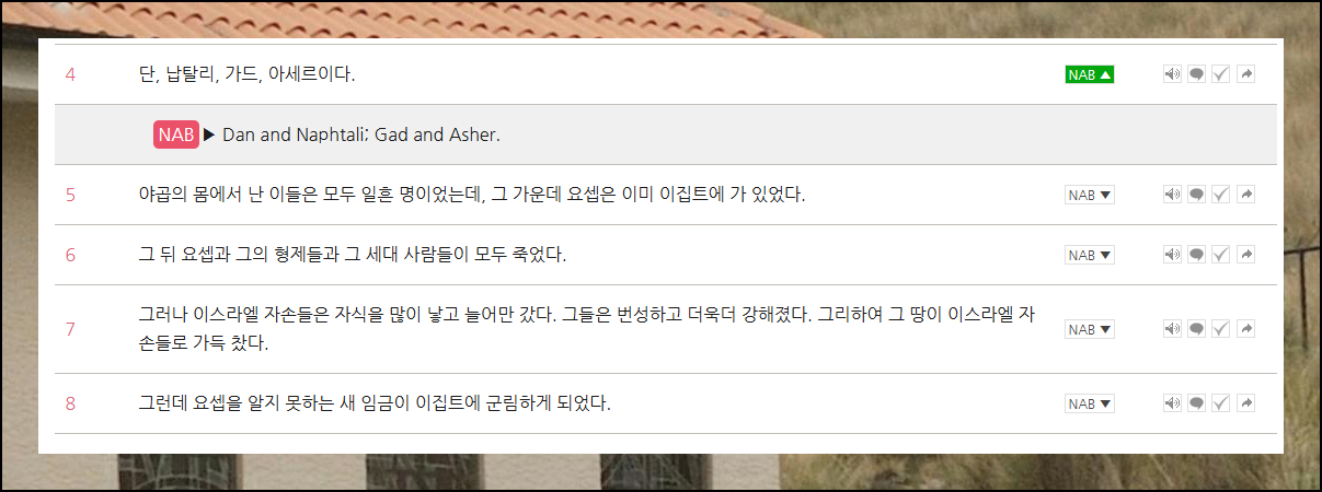 천주교 성경 비교 메뉴는 매우 유익한 기능입니다. 천주교 성서, 성경, NAB 등 다양한 번역본의 동일한 구절을 한 화면에서 쉽게 대조해볼 수 있어요. 궁금한 내용이 있다면 원하는 구절을 선택해보세요.