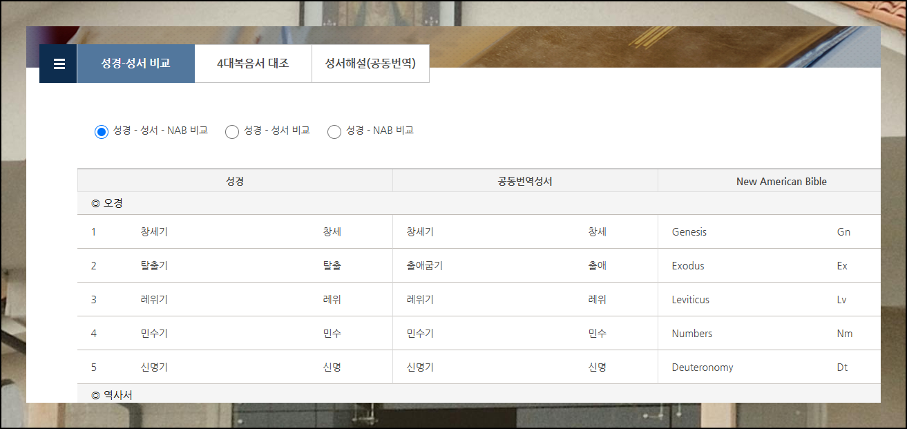 이곳에서는 구약 및 신약, 영어 NAB, 구약성서, 신약성서 등 여러 버전의 가톨릭 경전을 제공합니다. 원하는 버전을 선택하면 다양한 챕터가 순서대로 표시되니, 열람하고 싶은 부분을 클릭하여 내용을 확인하세요.