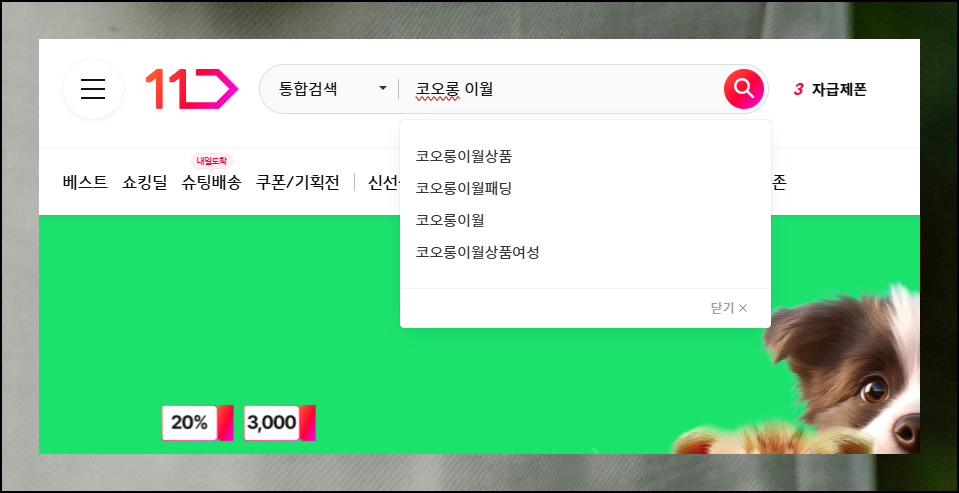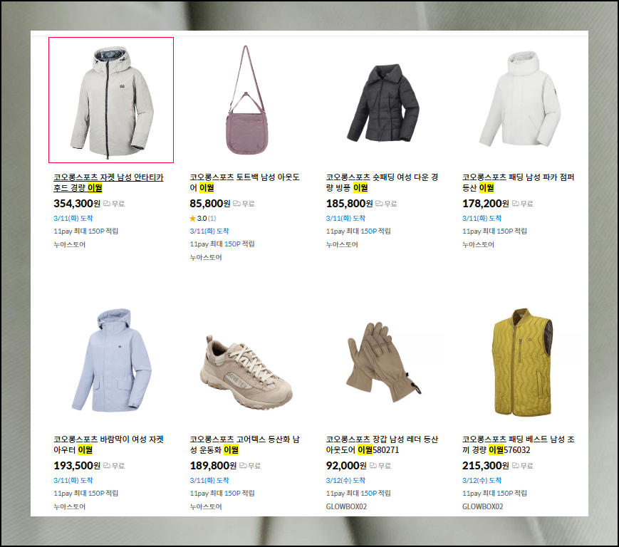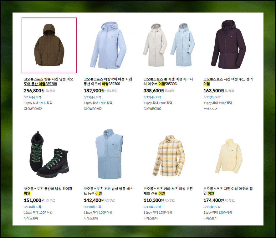 11번가에 접속한 후 검색창에서 '코오롱 이월'을 입력하고 엔터키를 누르세요. 원하는 제품을 더 빨리 찾으려면 '자켓', '팬츠'와 같은 구체적인 품목을 함께 입력하는 것도 좋습니다.