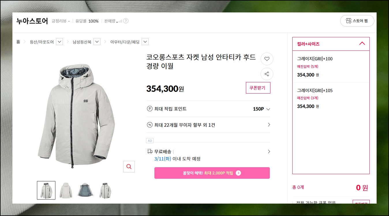 보통 온라인 쇼핑사이트를 이용하면 택배배송, 매직픽업, 퀵배송과 같은 방식으로 받아볼 수 있는데요. 요즘에는 택배도 빠르기 때문에 개인적으로 택배배송을 선호합니다. 이월상품 특성상 인기 색상과 사이즈는 빠르게 품절이 될 수 있으니 서둘러 확인하세요. 코오롱스포츠 컬렉션은 시즌이 지나도 품질이 뛰어나 가성비 면에서 정말 좋습니다.