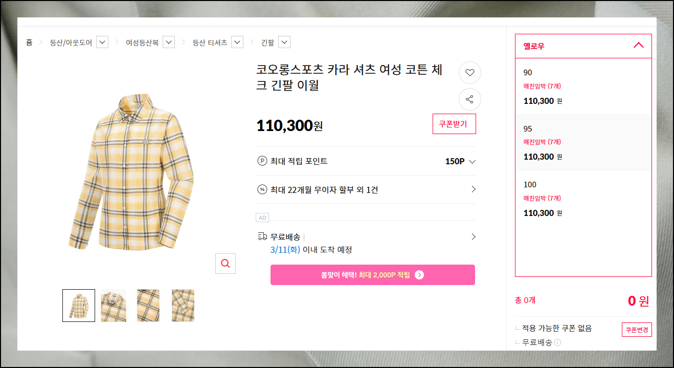 일반적으로 쇼핑 사이트에서 제공하는 앱을 이용하면 추가 할인을 받을 수 있습니다. 시기에 따라 다르지만, 주기적으로 카드할인이나 쿠폰 제공을 해주기 때문이죠. 코오롱스포츠의 여성 중기장 프린트 캐주얼자켓, 아웃도어 워킹화, 슬림 7부 팬츠, 루즈핏 트리코트 메쉬팬츠, 집업 티셔츠 등 다양한 제품을 더 경제적인 가격으로 구입해 보세요. 11번가 앱을 통해 앱 전용 쿠폰이 있는지 확인은 필수입니다.