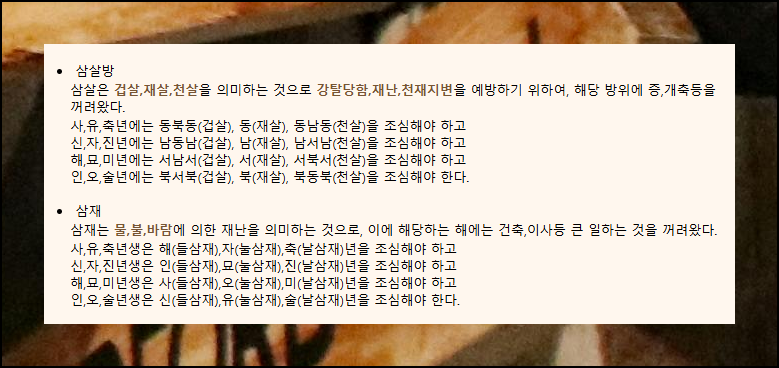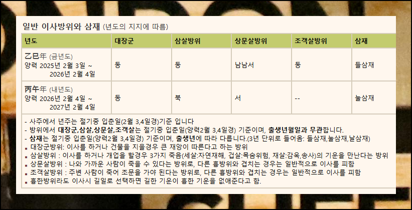 이동 방위에 관한 기초 지식이 중요합니다. 전통적으로 우리 조상들은 대장군방과 삼살 방위는 피했어요. 좋은 기운의 위치로는 천록(재물), 식신(재물), 합식(재물과 명예), 관인(승진/합격) 네 가지가 있습니다. 반면 대장군방과 삼살방으로 이주하면 안 좋은 영향을 받을 수 있으니 주의하세요.