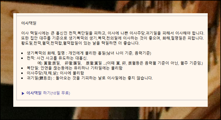 안내 페이지 하단에 "이사택일 하기 (10일 무료)" 버튼이 있어요. 이 기능을 통해 나에게 맞는 맞춤형 해석 결과를 확인할 수 있습니다. 이사 방향 보는법은 이렇게 간단하니 걱정마세요.