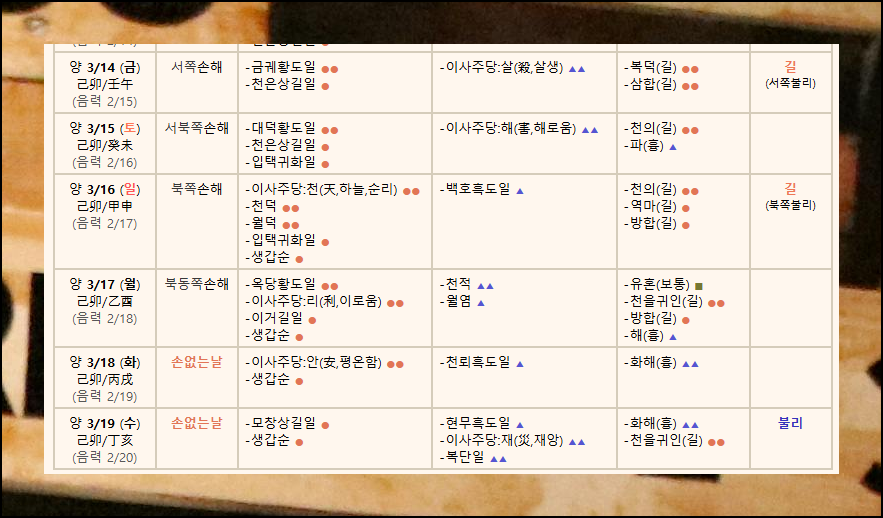마지막으로 일별 손없는날 정보와 피해야 할 방향을 검토할 수 있어요. 표에서 주황색 동그라미는 길한 날, 파란색 세모는 불길한 날을 의미합니다. 주황 동그라미가 많을수록 이주에 적합한 날이에요. 이런 식으로 풀이 보는법은 어렵지 않습니다. 여기서 명확하게 길한 날과 흉한 날을 찾아볼 수 있어요. 그럼 이러한 내용을 제대로 파악하여 새 집에서의 행운을 높여보시길 바랍니다.