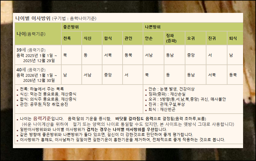 나이별 이주 방위 섹션에서는 올해와 내년에 좋은/나쁜 기운을 주는 방향을 살펴볼 수 있어요. 좋은 위치 4가지(천록, 식신, 합식, 관인)와 나쁜 위치 5가지(안손, 징파, 오귀, 진귀, 퇴식)가 표시됩니다. 이사방향 보는법은 표 아래 설명을 참고하세요. 나쁜 방위는 건강 문제, 재산 손실, 불운 등을 초래할 수 있으니 참고하세요.