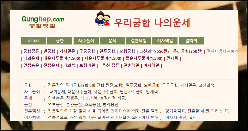 이사 방위 확인은 역술 서비스로 간편하게 할 수 있습니다. 순차적으로 따라하면 쉽게 활용 가능해요. 먼저 궁합닷컴에 접속하세요. 이곳은 궁합, 사주풀이, 운세, 택일 등 다양한 역술 정보를 제공하는 웹사이트입니다.