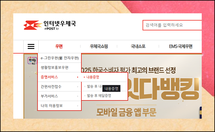 인터넷우체국에 접속해서 우편 메뉴의 증명서비스를 선택하면 내용증명 버튼이 표시돼요. 이 영역에서 보낸 문서를 여러 방식으로 확인할 수도 있어요.
