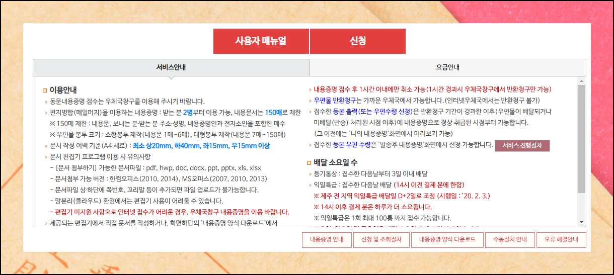 이곳에서 내용증명을 신청할 수 있어요. 이용안내를 통해 자세한 발송 방법을 파악하세요. 등기통상은 접수 다음날부터 3일 내 전달되고, 익일특급은 다음날 도착합니다. 서식 자료는 [내용증명양식다운로드] 버튼을 눌러 무료로 다운로드 받을 수 있어요.