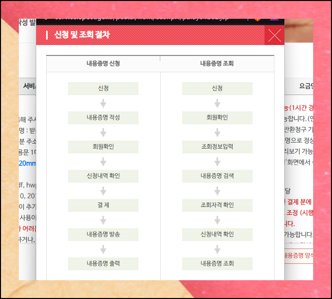 내용증명을 처음 발송하는 분들은 [신청 및 조회 절차] 버튼을 클릭해보세요. 문서 전송과 조회 과정을 쉽게 이해할 수 있습니다.