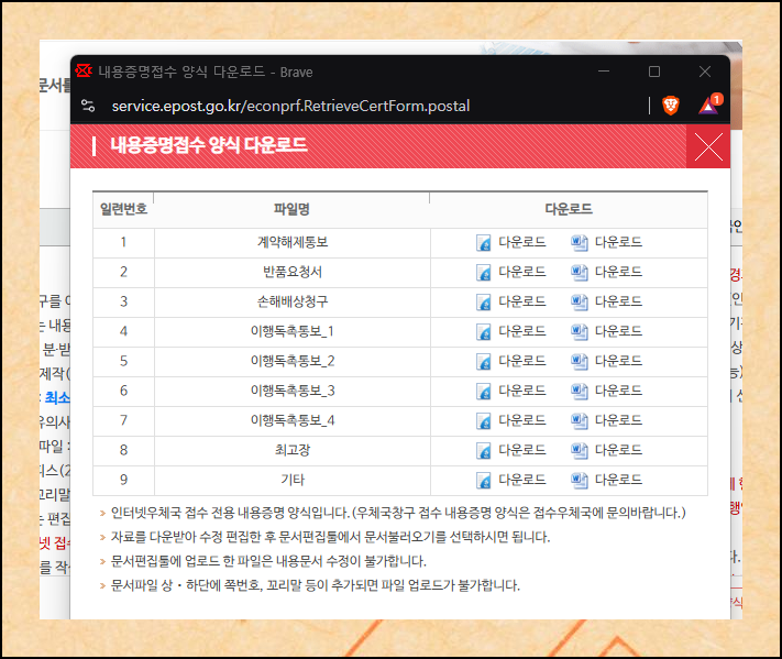 인터넷우체국 홈페이지에서 내용증명 서식을 손쉽게 다운로드할 수 있어요. 작성한 문서는 우체국을 통해 즉시 발송이 가능합니다. 사이트 활용 방법을 단계별로 안내해드릴게요. 일단 바로 다운로드 받아 사용할 수 있도록 아래에 자료를 첨부했습니다.