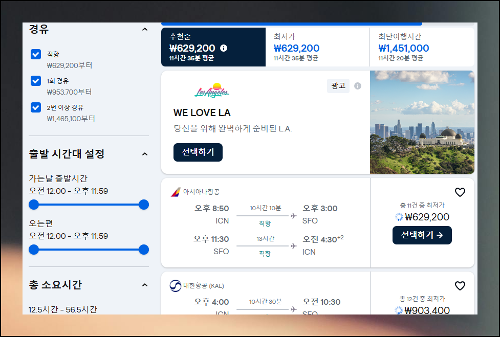 빈자리가 남으면 손해인 호텔, 렌트카와 같은 여행 관련 상품은 요금비교 사이트로 합리적으로 구매 가능해요. 미국행 항공권은 고가지만, 최저가로 검색하면 왕복 60만원대로 여행할 수 있습니다. 시즌별로 운임이 달라지니 프로모션이 있다면 적극 활용해 보세요.