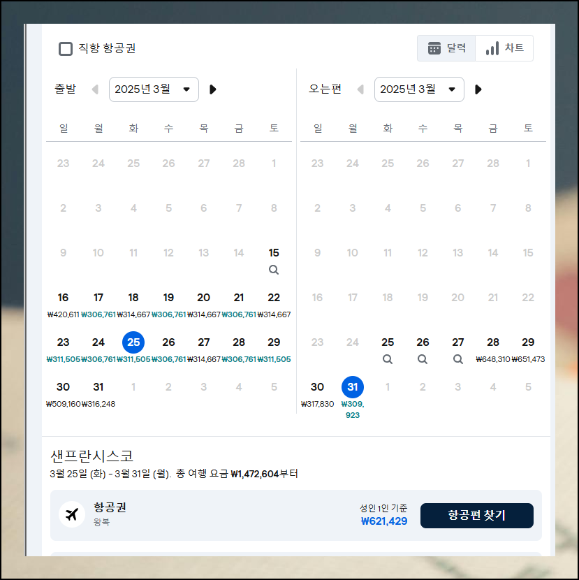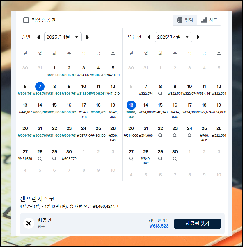 '직항만' 옵션을 해제하면 왕복 최저 운임을 좀 더 낮출 수 있어요. 이전에는 10만원 이상 낮췄었는데요. 금일 기준으로는 별로 낮아지지 않았네요. 다른 날에 이 방법을 사용하면 꽤 좋은 금액의 비행기표를 구할 수 있을 겁니다.
