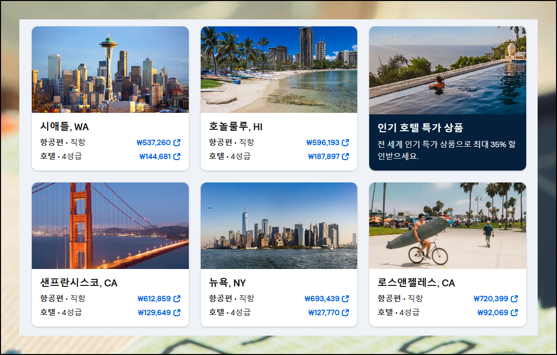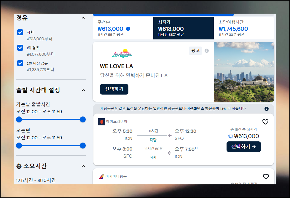 빈자리가 남으면 손해인 호텔, 렌트카와 같은 여행 관련 상품은 요금비교 사이트로 합리적으로 구매 가능해요. 미국행 항공권은 고가지만, 최저가로 검색하면 왕복 60만원대로 여행할 수 있습니다. 시즌별로 운임이 달라지니 프로모션이 있다면 적극 활용해 보세요.