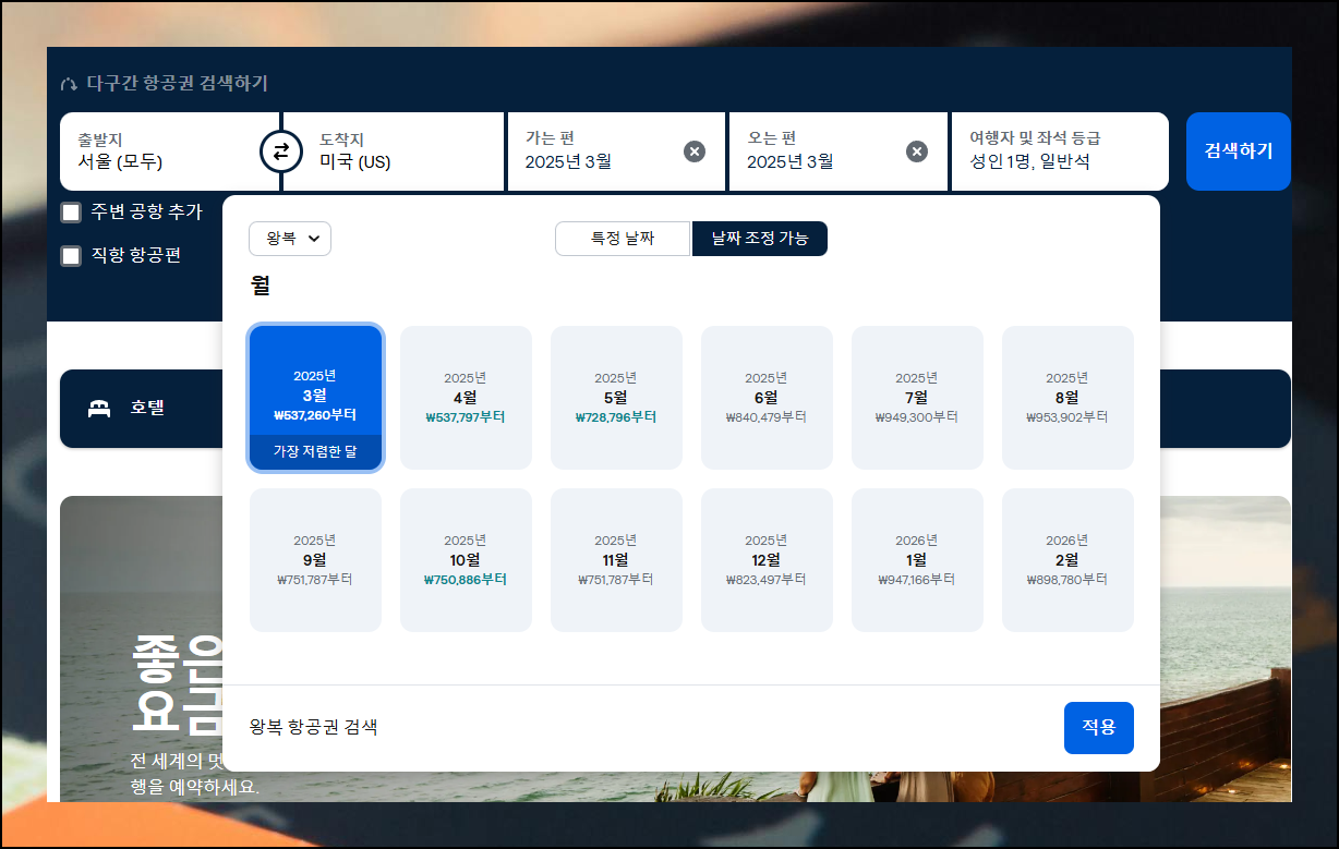 스카이스캐너에서 도착지를 '미국'으로, 날짜를 '가장 저렴한 달'로 설정하세요. 날짜별 비행기표 가격을 비교하여 최저가를 찾을 수 있어요. 참고로 평일이나 비수기는 주말보다 비행기표 요금이 저렴한 편입니다.