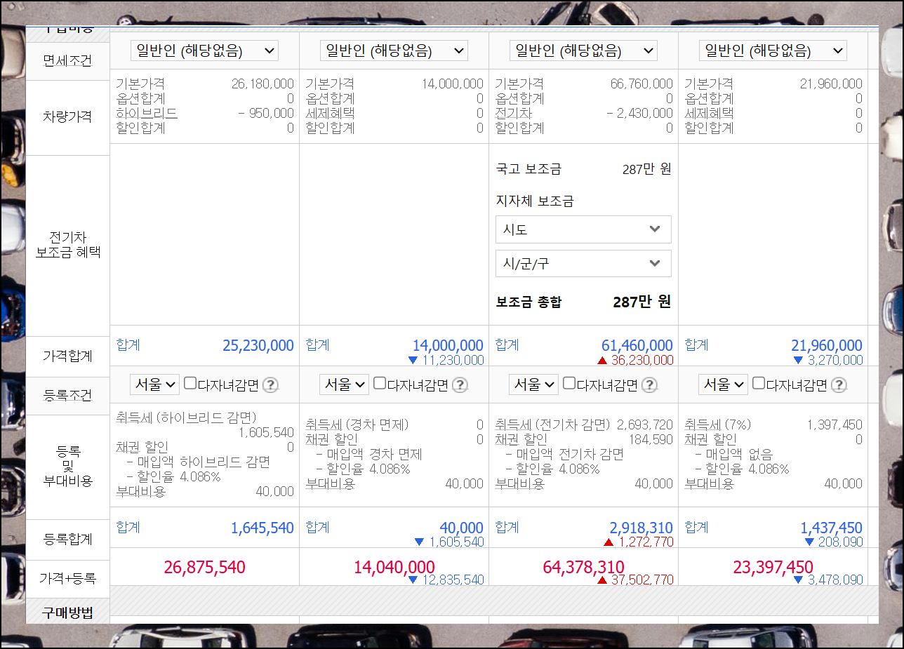 세부 모델, 옵션, 판매조건과 함께 면세 여부나 등록 지역까지 모든 항목을 입력하면 사이트에서 자동으로 최종 구매 비용을 계산해 줍니다.