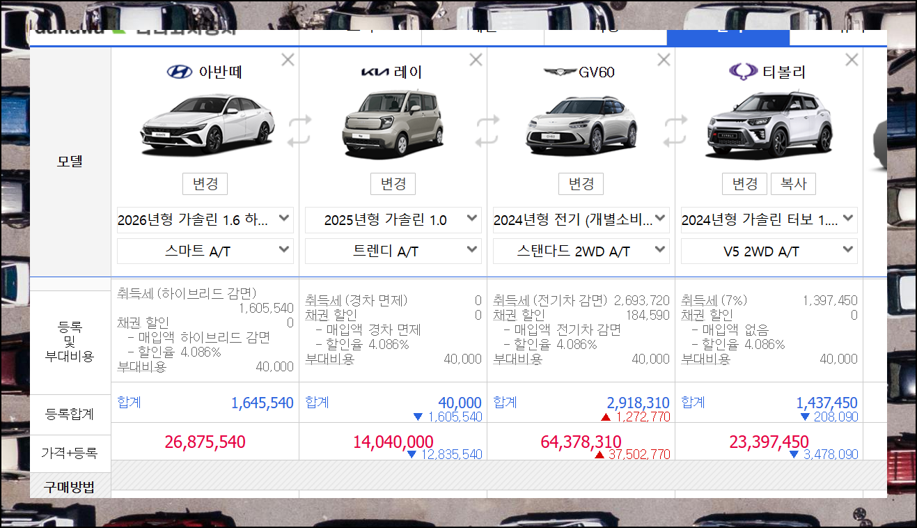 여러 차량 모델을 선택해서 가격과 다양한 기준으로 살펴볼 수 있는 편리한 플랫폼이 있어요. 가격은 물론이고 자동차 선택에 도움되는 여러 정보를 한 화면에서 확인할 수 있답니다. 한 번에 5개 모델까지 비교가 가능하니 구매 전 꼭 활용해보세요.