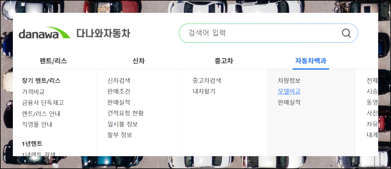 다나와 홈페이지에서는 렌트, 리스, 신차, 중고차 등 다양한 서비스를 이용할 수 있어요. 소개해드릴 기능은 [자동차 백과] 메뉴 안에 있는 [모델비교] 서비스로, 이를 활용하면 여러 차종을 효율적으로 살펴볼 수 있답니다.
