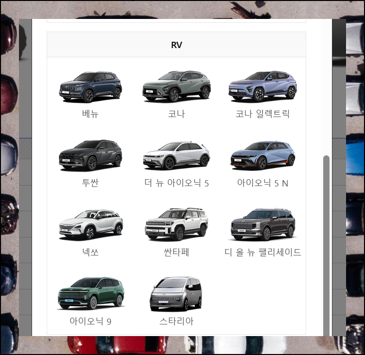 사이트에서 브랜드를 고른 후에는 구체적인 모델을 선택해야 해요. 예를 들어 현대를 선택하면 캐스퍼, 아반떼, 쏘나타 등 현대의 모든 출시 차종을 확인하고 골라볼 수 있습니다.