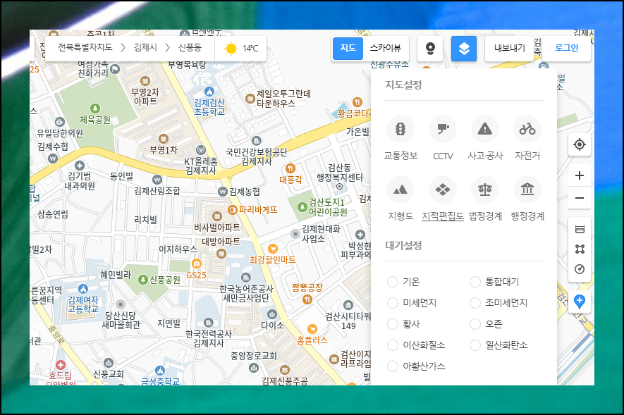 카카오맵에서 원하는 화면을 조회하려면 우측 상단의 설정 아이콘을 클릭하세요.