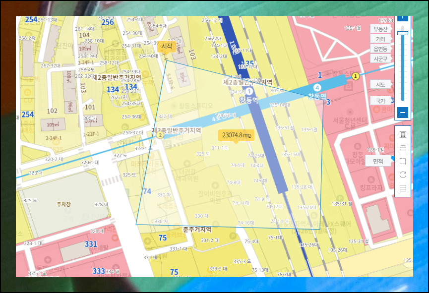 씨리얼에서는 편리한 계산 기능도 제공해요. 우측의 면적 도구를 클릭하고 지적도에서 측정하고 싶은 구역을 마우스로 그려보세요.