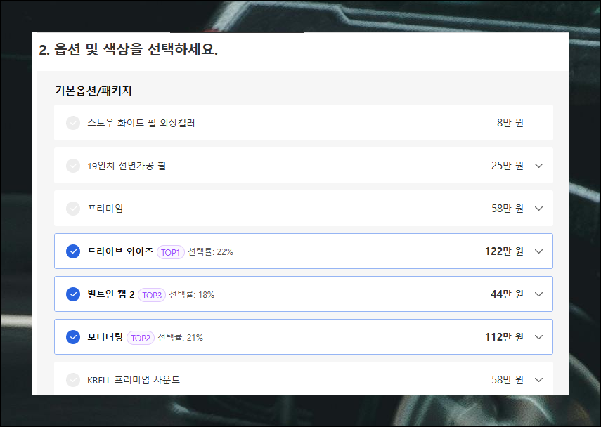 기본 옵션부터 패키지, 튜닝, 액세서리까지 다양한 선택지 중에서 개인의 필요와 선호에 맞는 것을 고르세요.