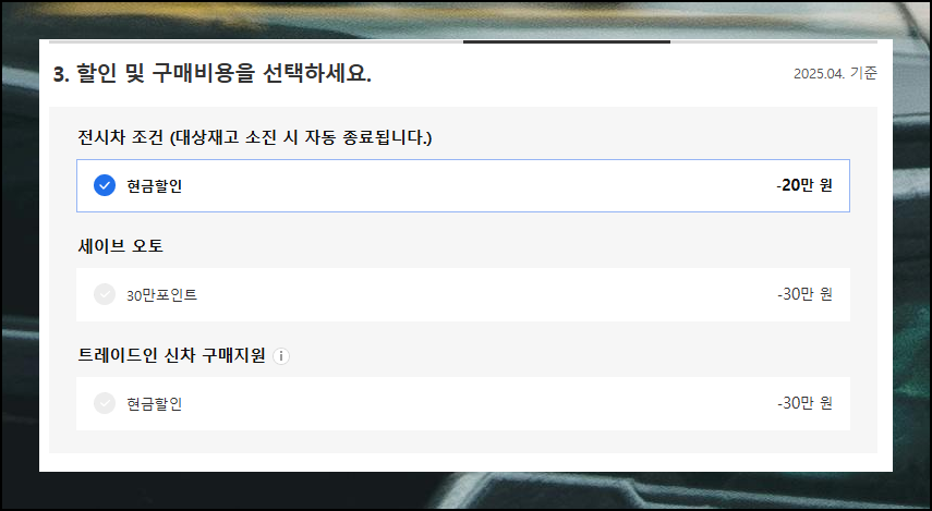 전시차 구매, 프로모션, 이벤트 참여 등 다양한 특별조건을 활용하면 기본 표시가보다 저렴하게 신차가격표 대비 할인된 금액으로 구매 가능해요.