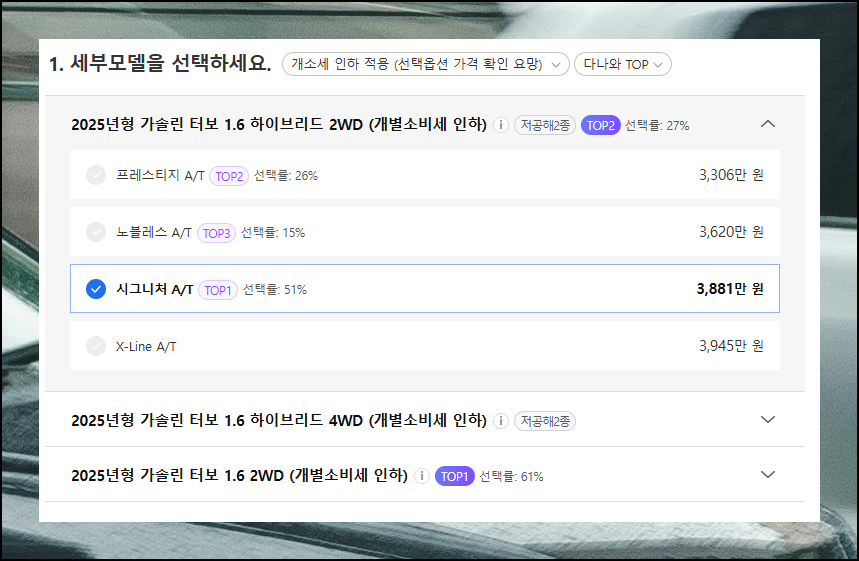 마우스 클릭 몇 번으로 원하는 모델과 옵션을 선택하면 자동으로 최종 구매 금액까지 계산해주니 대리점 방문 전에 미리 예산을 짜볼 수 있습니다.