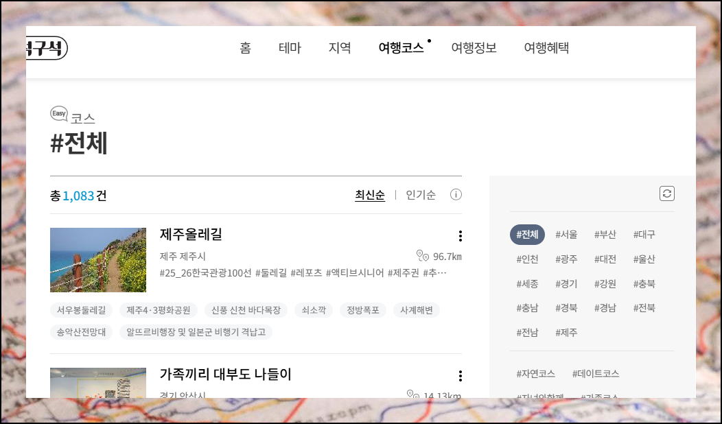 제주도에는 17개의 다채로운 코스가 마련되어 있어요. 최신순이나 인기순으로 정렬해 원하는 국내여행 루트를 찾아보세요.